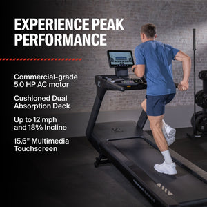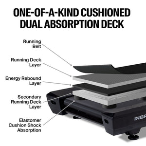 The one-of-a-kind, innovative Cushioned Dual Absorption Deck minimizes impact, reduces shock, and boosts stability for unparalleled comfort and support. Train for any environment with a 22” x 60” running surface with our Natural Stride Technology that adjusts the speed of the tread to your running pace. The Inspire Fitness T7S Treadmill W/15.6" LED Touchscreen features a 5.0 HP AC motor, maintenance-free belt, and superior limited lifetime warranty, setting a new standard for durability in home fitness equipment.