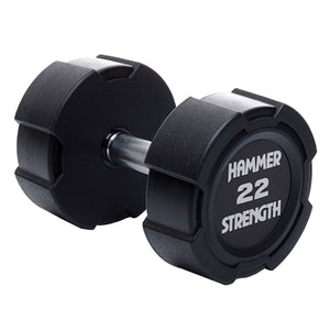 The Hammer Strength Urethane Dumbbells - Sets boast exceptional durability thanks to their dual or triple lock, securely fastened head-to-handle system. The inclusion of anti-roll heads, compact design, and hard chrome plated handles make these dumbbells both user-friendly and highly controllable.