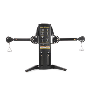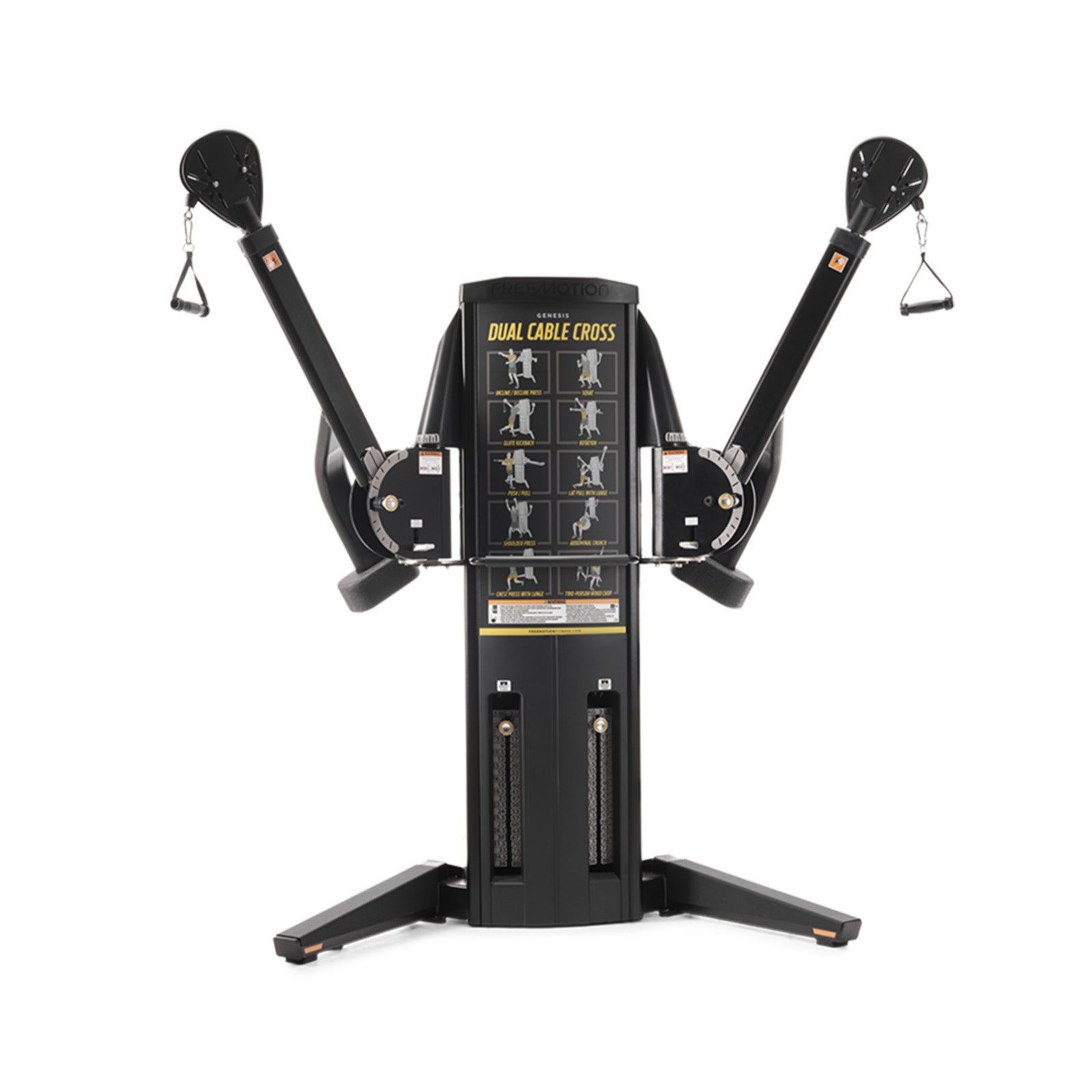 The Freemotion Genesis Dual Cable Cross allows users to begin exercising immediately without any adjustments—just grab the handles and start. Its extensive cable length supports full range of motion, with single-arm travel of 76 inches (193 cm) and dual-arm travel of 38 inches (96.5 cm). The enclosed weight stacks enhance safety by restricting access to moving parts. Built from durable 11- and 7-gauge steel with a powder-coated finish, this machine is designed for long-lasting performance. Large 16-gauge stainless steel kick plates protect against damage from regular use.