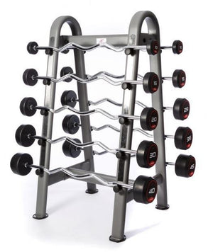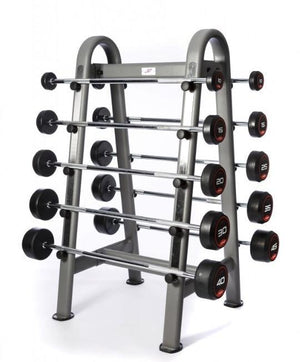 This JORDAN® Fixed Barbell Rack is designed to store 10 fixed barbells by Jordan. It is a durable and robust option that provides gyms and commercial health clubs with a designated storage area for their barbells, ensuring they are always organized and readily available for use.