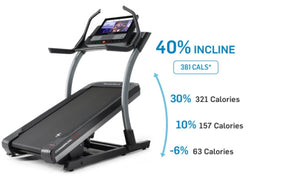 The NordicTrack Commercial X22i Treadmill boasts a robust 4.0 CHP drive system, 2.5” precision-balanced rollers, and Reflex™ deck cushioning for optimal home cardio workouts. With digital quick controls, you can easily adjust your workout by changing the incline from 0% to a remarkable 40% (which can help you burn five times more calories than a traditional treadmill!), decline to -6%, and increase your speed to 22kph with the press of a button.