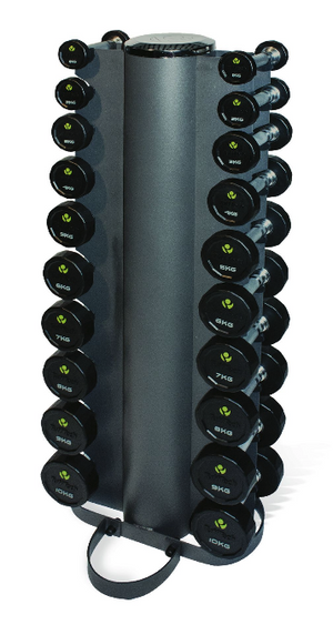 Physical free standing dumbbell rack designed to hold Tufftech Rubber Hex and Tufftech Chrome Dumbbells. The rack will hold other makes of dumbbells as long as they have a standard fixed chrome handle.