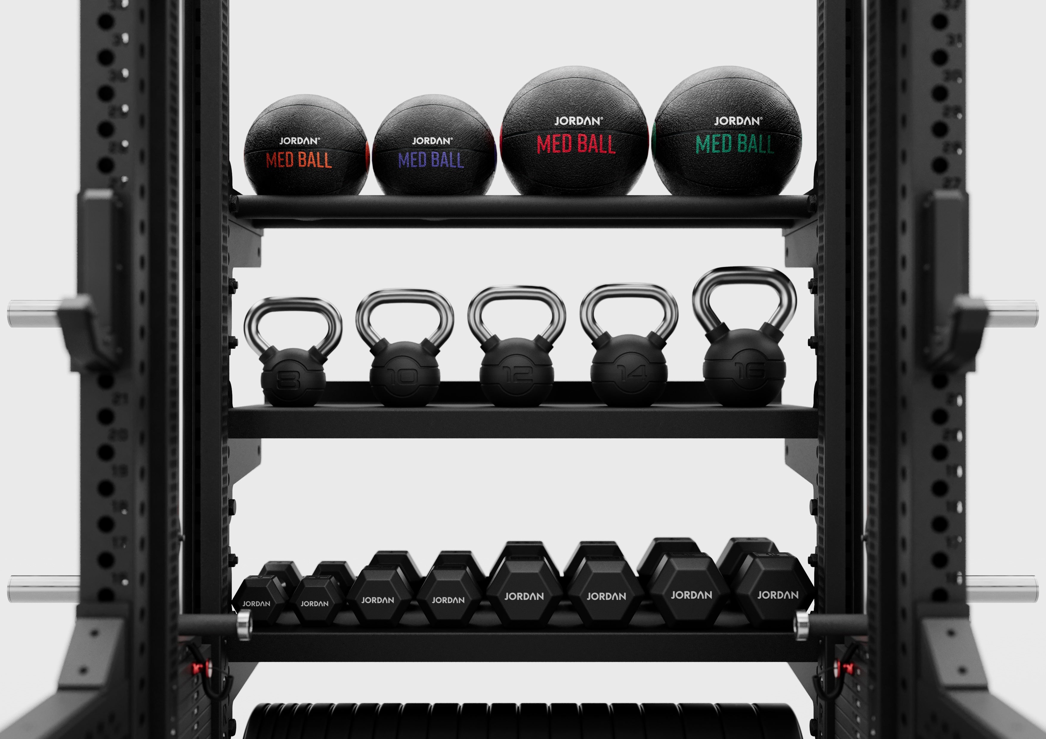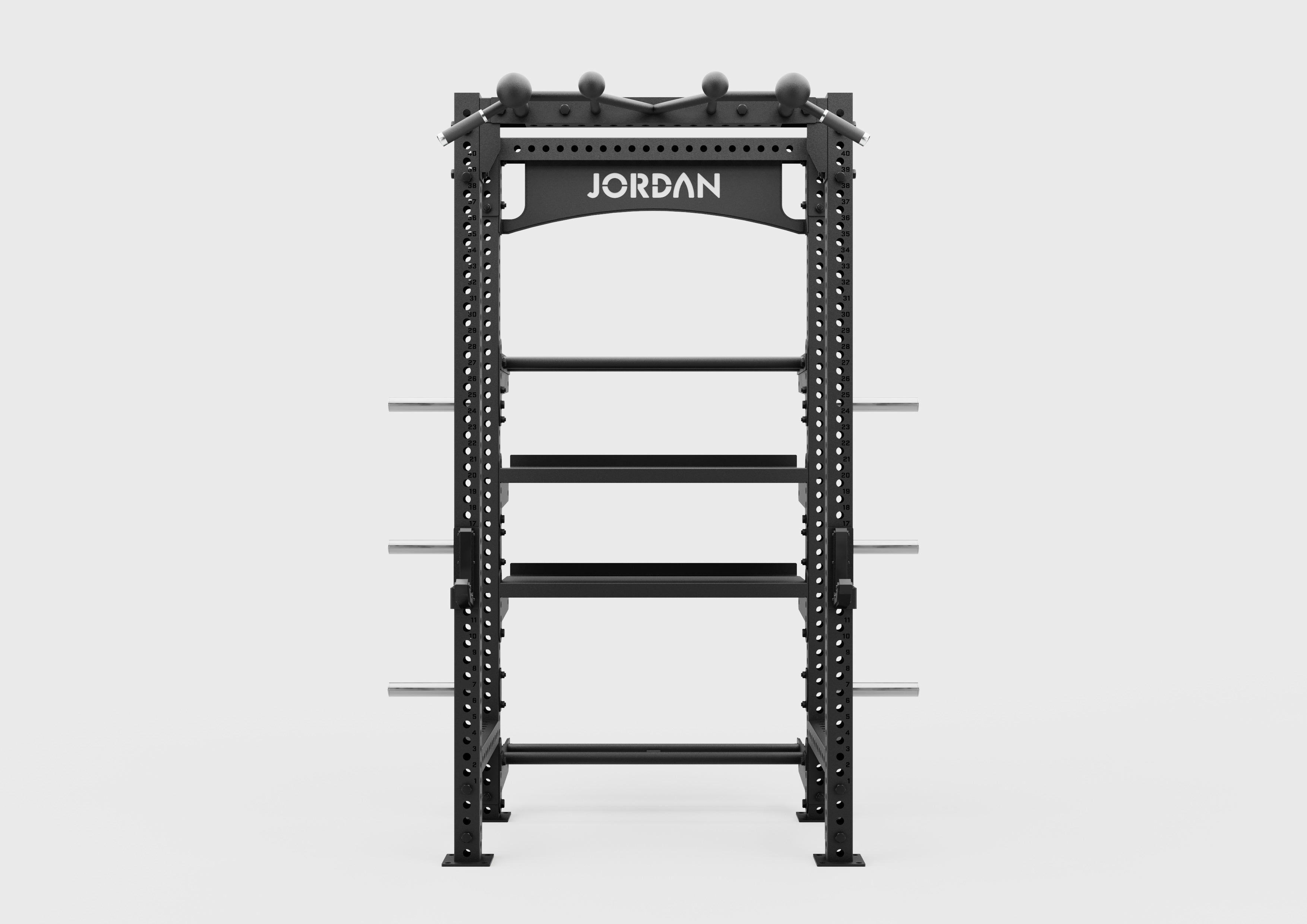 The JORDAN J75 Compact Power Rack - Black is a versatile, compact power rack designed for use in busy gyms and homes. It is commercial-grade and can be easily expanded with additional attachments for a varied workout experience. The included accessories are a pair of J-hooks, a multi-handle pull-up bar, and six weight horns for convenient weight plate storage.