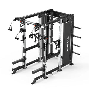The Primal Performance Series V2 Modular Power Rack features a sturdy base and is equipped with essential accessories, such as monolift hooks, sandwich J-hooks, and front safety catchers. It also includes adjustable band pegs for added resistance or assistance during exercises, and a top-of-the-line landmine for smooth movements.