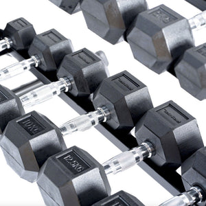 Introducing the Primal Personal Series 2 Tier Hex Dumbbell Rack, designed to efficiently store your hex dumbbells. With a sleek gloss black finish, this compact rack can hold up to 6 pairs of dumbbells in the 1-15kg range. Maximize your home gym space and keep your equipment organized. *Dumbbells sold separately.