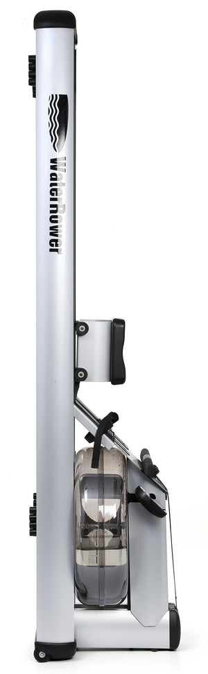 The WaterRower M1 combines sophisticated commercial design with simple user friendly operation. The frame is contemporary design is complimented by its protective silver coating and the transparent water tank engages the user allowing them to see and hear the moving water.