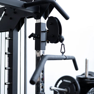 The system features a versatile multi-grip pull-up bar that caters to various muscle groups for enhanced engagement during pull-ups and chin-ups. This seamlessly transitions into the efficient dual adjustable pulley system, complete with a 1:1 pulley ratio and adjustable cable handles for tailored resistance training.