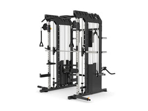 Equipped with a built-in smith machine, featuring sealed bearings for optimal lifting, promoting precise form during your workout. The addition of a half rack with bar catchers and spotter catchers adds extra safeguards for heavy lifts. For a wider range of exercises, the system includes a landmine/core-training/T-bar attachment, targeting core muscles and enhancing your strength training regimen.