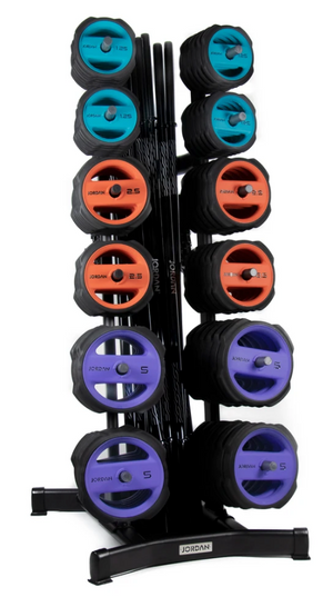 • This set of Jordan Ignite Pump X Urethane Studio Barbell Sets is ideal for gym and studio classes and circuits. It includes bars, color-coded weight plates, collars, and a black rack, making it a comprehensive package.