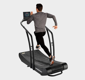 • Experience an innovative training session on the patented WOODWAY Curve Treadmill with the Pro Smart 10 Console. This manual treadmill does not require electricity and provides a remarkable workout experience. Move freely on the curved running surface, as your body generates the power. The Curve Treadmill invigorates the whole body, allowing you to burn up to 30% more calories than traditional treadmills.