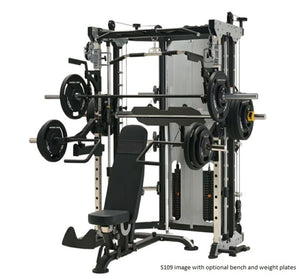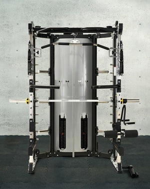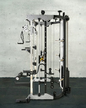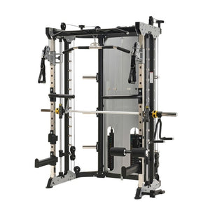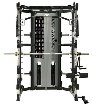 The Body Dynamic S109 All-In-One Functional Smith Machine includes a power rack, functional trainer, smith machine, dip station, chin-up station, leg press, core trainer, suspension trainer & low row, all rolled into one convenient unit. Its adjustable commercial J-Hooks make it ideal for bench or squat. It's fitted with dual cable pulleys at a 95Kg weight stack, plus a counterbalanced Smith Machine and 2000 lbs-rated aircraft-grade cables. Vertical Leg Press & Low Row features provide full-body workouts, while an ergonomically-designed multi-grip chin-up station with 771 lbs. max weight rating can accommodate various grip styles. With a Multi-Grip Dip Handle, vertical power rack adjust, resistance band compatibility & a barbell-compatible landmine station, it ensures comprehensive upper body training.