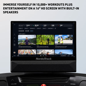 The 16” HD touchscreen tilts for a clear view wherever you set up. It’s just as handy for runs as it is for stretching or following a quick strength session nearby. Stream a workout, play some music, or catch a show while you train.